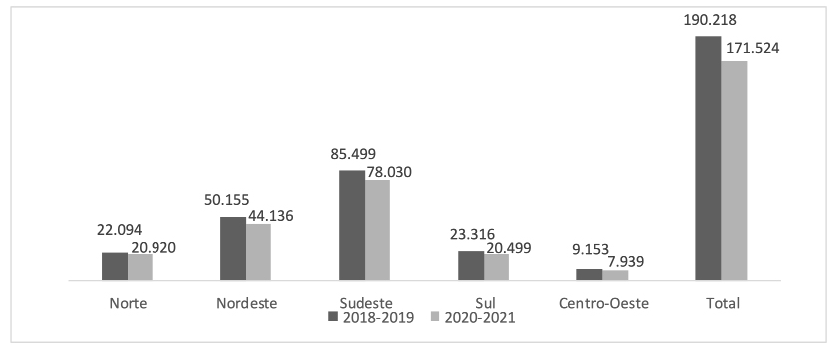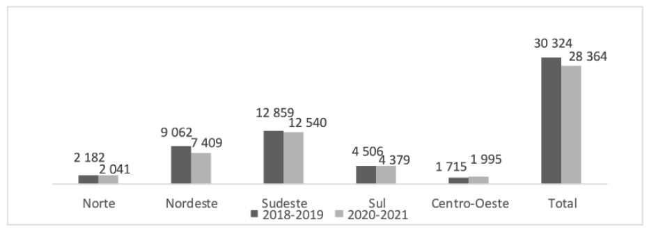 Figura 2: Número de internações por tuberculose antes (2018-2019) e durante a pandemia da Covid-19 (2020-2021), de acordo com as regiões do Brasil, 2018 a 2021. Fonte: Sistema de Informações Hospitalares do SUS (SIH/SUS).