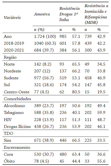 Analisando os dados epidemiológicos associados à resistência farmacológica, entre os pacientes, nota-se que 0.48% dos casos notificados no país apresentavam resistência. Desses, a maioria antes e durante a pandemia da covid-19 apresentam resistência a drogas de primeira linha (57.8% e 56,1%). A região Sudeste apresentou o maior percentual entre os casos resistentes (56.7%). As comorbidades associadas mais frequentes entre os pacientes com TB resistente foram: tabagismo (35.8%) e uso de drogas ilícitas (26.7%). 38.9% dos pacientes realizaram o tratamento diretamente observado e 30,7% evoluíram para cura (Quadro 2).