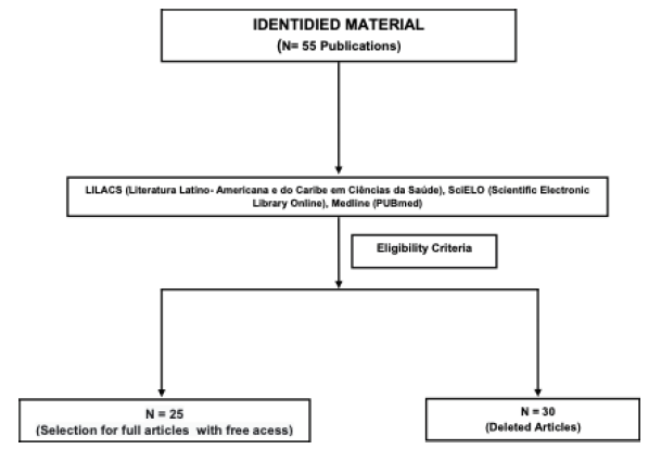 The study used inclusion criteria that required publications in English, Portuguese, and Spanish, in the form of full-text articles that were freely accessible through the Virtual Health Library (VHL) databases LILACS, SciELO, and Medline (PubMed). Dissertations, theses, and book chapters were excluded. The initial screening of the bibliographic material involved reading the abstracts to identify articles that met the study’s objectives. Of the 55 publications identified from 2016 to 2021, only 25 met the inclusion criteria (Figure 1). After the initial screening, each article was thoroughly read to extract and systematize the relevant information according to Table 1.