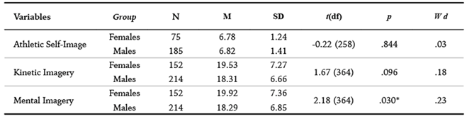 For athletic self-image, there was no significant difference in scores between females (M = 6.78, SD = 1.24) and males (M = 6.82, SD = 1.41), t (258) = -.22, p = .844, Cohen’s d = .03. Similarly, the difference in kinetic imagery between females (M = 19.53, SD = 7.27) and males (M = 18.31, SD = 6.66) was not statistically significant, t (364) = 1.67, p = .096, Cohen’s d = .18.