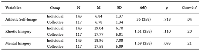 Independent samples t-tests revealed no significant differences between athletes in individual and collective sports on any of the dependent measures (see Table 2). There were no significant differences for athletic self-image (p = .718), kinetic imagery (p = .110), or mental imagery (p = .093). The effect sizes for all comparisons were small.