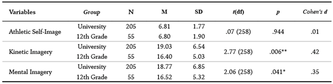 However, significant differences emerged for both imagery dimensions. University athletes (M = 19.03, SD = 6.54) reported significantly more difficulty with kinetic imagery than 12th-grade athletes (M = 16.40, SD = 5.03), t (258) = 2.77, p = .006, Cohen’s d = .42. Similarly, university athletes (M = 18.77, SD = 6.85) reported significantly more difficulty with mental imagery compared to 12th-grade athletes (M = 16.52, SD = 5.32), t (258) = 2.06, p = .041, Cohen’s d = .35.