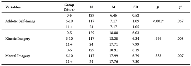 The ANOVA revealed a statistically significant difference in athletic self-image based on years of practice, F (2, 267) = 9.66, p < .001, with a medium effect size (η² = .067). Post hoc comparisons using the Scheffé test indicated that the mean score for the 0-5 years group (M = 6.45, SD = .52) was significantly lower than the 6-10 years group (M = 7.17, SD = 1.09). No significant difference was found between the 6-10 years group and the 11+ years group (M = 7.17, SD = 1.05).