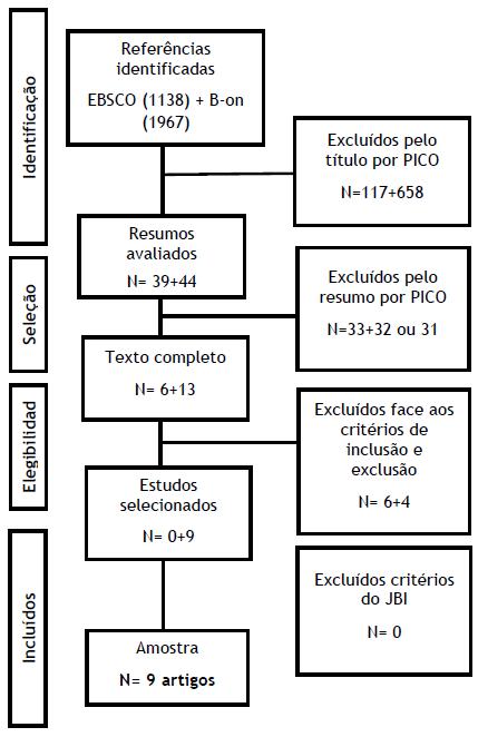 Replicando-se a mesma metodologia na plataforma B-on foram encontrados 1967 artigos dos quais, 702 artigos foram selecionados após a inserção dos critérios de inclusão. Destes, 658 foram rejeitados pelo título ou pelo assunto e 31 pelo resumo. Dos 13 resultantes, 4 foram excluídos após a leitura integral do texto, dado não cumprirem os critérios de inclusão definidos. Como resultado final obtiveram-se 9 artigos que preenchem os critérios de inclusão.