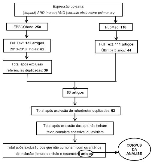 Face ao propósito da revisão sistemática, definiu-se como expressão booleana (impact) AND (nurse) AND (chronic obstructive pulmonary disease). Em abril de 2018, procedeu-se à pesquisa eletrónica na base de dados EBSCOhost (na CINAHL Plus, na MEDLINE, Academic Search Complete, Business Source Complete, MedicaLatina, Chrocrane Central Register of Controlled Trials), obtendo-se 250 artigos. Selecionou-se a opção ‘Full Text’ (132 artigos), dentro do limite temporal 2013-2018, em inglês (não havia artigos disponíveis em português), ficando 62 artigos. Destes, foram eliminados (pela própria base de dados) os artigos duplicados, obtendo-se 39 artigos. Paralelamente, fez-se nova pesquisa na PubMed, com a mesma pesquisa booleana (118 artigos). Selecionou-se ‘Full text’ (111 artigos) e o limite temporal dos últimos 5 anos, ficando com 44 artigos. Também na PubMed não havia produção de artigos em português.