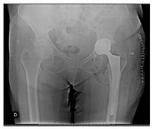 A admissão no serviço de Ortopedia do Centro Hospitalar ocorreu a 19/11/2020, com o diagnóstico de coxartrose esquerda, para cirurgia eletiva, que só se viria a realizar a 21/11/2020. Em relação aos exames pré-operatórios, foram realizadas análises sanguíneas, que se encontravam dentro dos valores de referência; eletrocardiograma, com ritmo sinusal; e radiografia do tórax e bacia (Figura 1). A senhora foi também submetida a uma avaliação por parte do anestesista, obtendo um risco cirúrgico de ASA II (American Society of Anestesiology), indicativo de doença sistémica leve. No dia 21/11/2020, foi submetida a artroplastia total da anca esquerda, sob raquianestesia, tendo o pós-operatório decorrido sem intercorrências e com controlo radiográfico da bacia após a cirurgia (Figura 2).