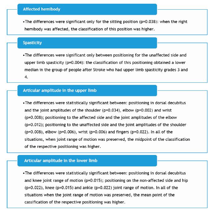 Joint mobility influences the positioning in an anti-spastic pattern because its decrease may lead the nurse to be unable to perform the positioning in an anti-spastic pattern. When the findings of this variable were analysed, significant differences were confirmed between: positioning in dorsal decubitus and the joint range of motion of the shoulder, elbow, wrist and knee; positioning for the affected side and the range of motion of the elbow; positioning for the non-affected side and the range of motion of the shoulder, elbow, wrist, fingers, knee and ankle, showing that when the joint range of motion was preserved the midpoint in the classification of the 3 types of positioning was higher. This may be due to the fact that the preserved joint amplitude facilitates correct positioning.