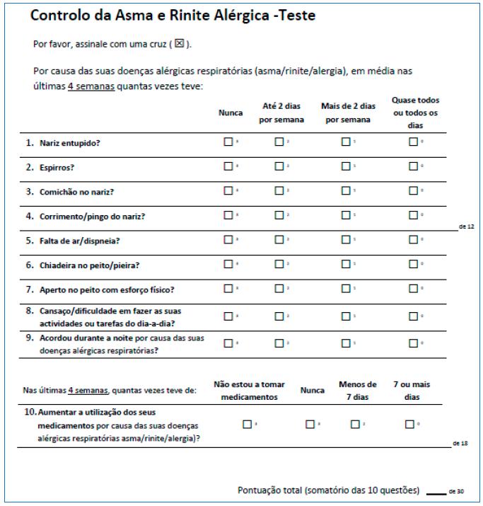 Este teste foi desenvolvido por especialistas no tratamento e gestão da asma e tem sido utilizado como referência do controlo sintomático da asma8. Pretende avaliar os sintomas de rinite alérgica e asma nas últimas 4 semanas, permitindo aferir se existe evolução no controlo sintomático.