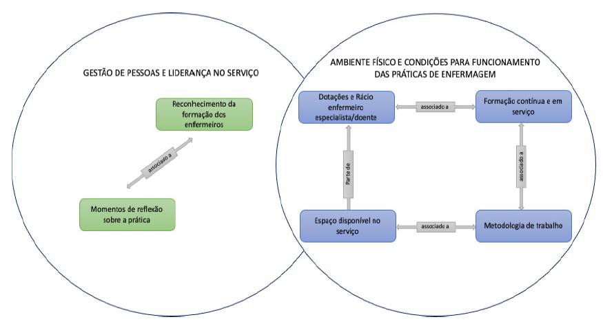 Uma vez clarificadas as associações identificadas, importa destacar que da análise dos discursos dos participantes, no âmbito da dimensão estrutura, emergiram duas categorias: gestão de pessoas e liderança no serviço e o ambiente físico e condições para funcionamento das práticas de enfermagem. Convém referir que nos discursos estas categorias emergem numa interação íntima entre elas, como demonstrado no diagrama seguinte (Diagrama nº2).
