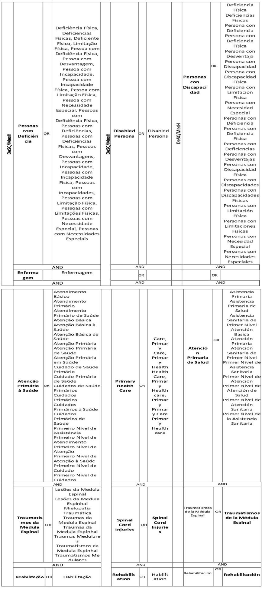 A estratégia de busca terá como objetivo localizar estudos publicados e lacunas do conhecimento existentes na literatura científica. A partir dos elementos do PCC selecionou-se um conjunto de descritores presentes nos Descritores de Ciências da Saúde (DeCS) e no Medical Subject Headings (MeSH) em português, inglês e espanhol. Estes descritores possibilitarão a elaboração de estratégias de busca com a combinação dos operadores booleanos (AND/OR) disponíveis nas bases de dados: Portal BVS, Pubmed, Scopus, Embase, Web of Science e Biblioteca Digital de Teses e Dissertações (BDTD) e literatura cinzenta.