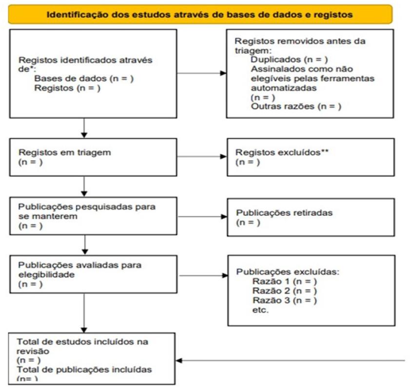 Os trabalhos selecionados em cada etapa da sistematização de revisão de escopo da JBI serão incluidas no gerenciador de Diagrama de Fluxo PRISMA, disponível em https://estech.shinyapps.io/prisma_flowdiagram/, o qual contribui para organizar e gerenciar as referências selecionadas. Ao final, será utilizado o Fluxograma (Imagem 2) para a sistematização das buscas.