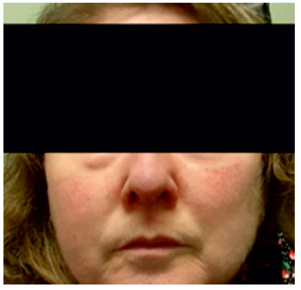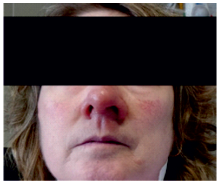 Figura 1 Pré-tratamento. Eritema bem demarcado no terço médio da face, homogéneo a nível das asas do nariz, columela nasal e filtrum nasal