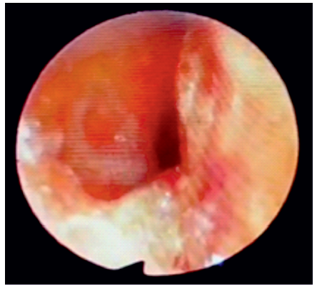 Figura 2 Endoscopia nasal - Fossa nasal direita. Múltiplas pequenas lesões, com bordos eritematosos.
