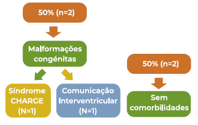 Foram observadas malformações associadas em 50% dos doentes (1 caso de comunicação interventricular e 1 caso de síndrome CHARGE).( Diagrama 1)
