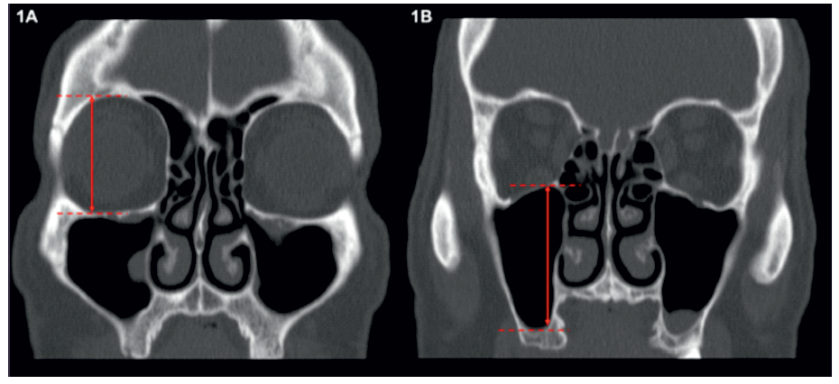 Figura 1 Demonstração da medição dos diâmetros verticais máximos da órbita direita (A) e do seio maxilar direito (B) para avaliação do grau de pneumatização do seio maxilar direito.