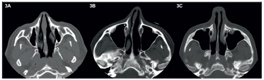 O RPL foi considerado como estando ausente quando a parede anterior do canal nasolacrimal (CNL) se encontrava adjacente à face posterior da parede anterior do seio maxilar (Figura 3A). Nos casos em que este se encontrava presente, este foi classificado como anterior caso parte do RPL se encontrasse anteriormente ao CNL ou como lateral caso o RPL se encontrasse totalmente lateralmente ao CNL (Figuras 3B e 3C).