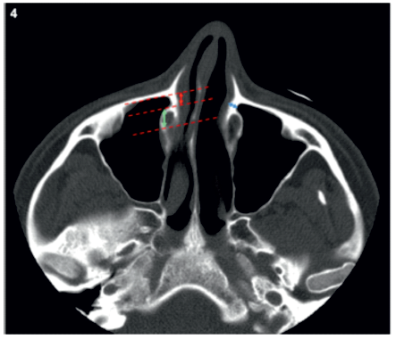 Para medir as larguras do RPL (largRPL) e do CNL (largCNL) foi traçada uma linha paralela à face posterior da parede anterior do seio maxilar e outras duas linhas paralelas a esta, uma tangente à parede anterior e outra à parede posterior do CNL, tendo sido medida a distância entre estas (Figura 4). Tendo em conta a sua largura, o RPL foi depois classificado de acordo com os critérios propostos por Simmen e colegas (14) em tipo I, caso esta fosse inferior a 3 mm, tipo II nos casos em que a largura estivesse compreendida entre 3 e 7 mm e tipo 3 caso esta fosse superior a 7 mm.