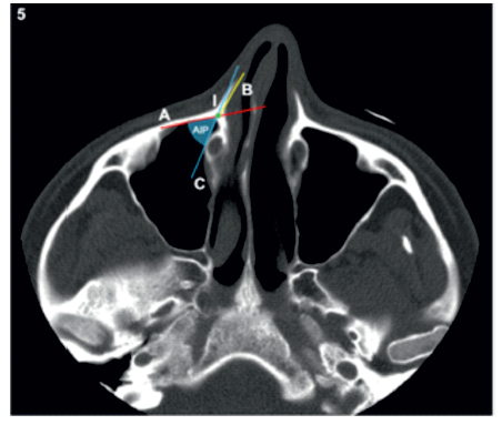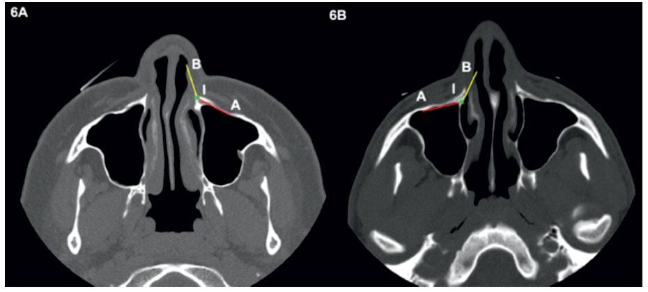 O ângulo da incisura piriforme (AIP) foi medido de acordo com os métodos descritos por Arosio et al.(13). Foi traçada uma linha paralela à face posterior da parede anterior do seio maxilar (linha A) e outra linha paralela à face interna da apófise frontal da maxila (linha B), tendo sido marcado o ponto de interseção entre as duas (ponto I). Foi definida uma terceira linha tangente ao CNL e que passava no ponto I (linha C). A amplitude do AIP foi medida entre as linhas A e C (Figura 5).