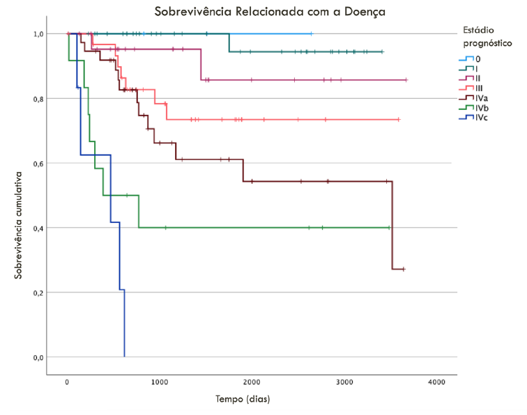A figura 1 representa as curvas de Kaplan-Meier para a SD categorizada pelos estádios prognósticos. Como seria expectável, a sobrevida dos doentes variou significativamente entre os diferentes grupos prognósticos, obtendo um teste Log Rank com valor de p<0,001. A figura 2 representa as curvas de Kaplan-Meier para a SD categorizada por tipo de tratamento instituído, sendo que este é altamente influenciado pelo próprio estádio.