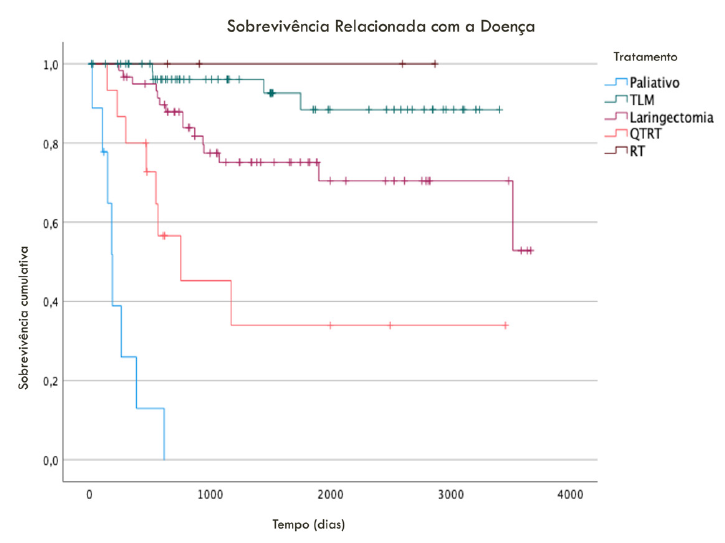 Em relação ao tratamento instituído, a grande maioria, 121 doentes, fez tratamento cirúrgico. Entre as modalidades cirúrgicas instituídas, observamos uma melhor sobrevida nos doentes que foram submetidos a TLM versus Laringectomia Total, refletindo naturalmente, as diferenças de estadiamento observadas, nomeadamente os tumores ressecados por TLM correspondem a lesões mais pequenas e localizadas quando comparados com os doentes propostos para laringectomia. Embora alguns estudos revelem sobrevida semelhante entre modalidades terapêuticas cirúrgicas e sistémicas para tumores localmente avançados 8, existem outros que favorecem a opção cirúrgica (9-11). Nesse sentido, existe uma preferência na nossa instituição pela cirurgia. Os doentes que foram encaminhados para tratamento com Quimio e Radioterapia Radical corresponderam a 15 casos, incluindo doentes que recusaram cirurgia, não tinham condições cirúrgicas/anestésicas, ou cujo tumor envolvia estruturas consideradas irressecáveis. Observamos na figura 2 que os doentes que realizaram este tratamento apresentaram uma curva de sobrevida muito inferior à dos doentes submetidos a cirurgia, existindo, contudo, um viés de seleção nos doentes encaminhados para QTRT, de tal modo que, após ajuste para fatores de confundimento, não encontrámos diferenças estatisticamente significativas na sobrevida dos doentes com tumores avançados que fizeram tratamento cirúrgico versus QTRT.