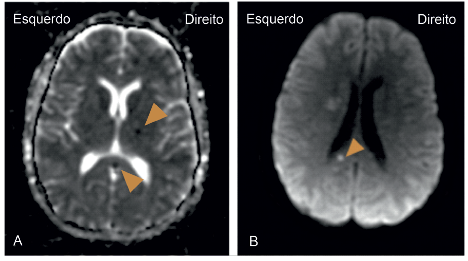 Figura 1 RMN-CE em corte axial com múltiplas lesões a envolver o corpo caloso e cápsula interna (cabeças de seta) sem captação de contraste em T2 (A) e com restrição à difusão (B)