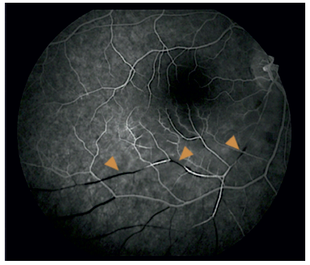 Figura 2 AF com hipoperfusão do ramo temporal inferior da artéria central retina (cabeças de seta) com isquemia da retina dependente desse ramo