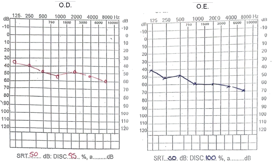 A avaliação formal da audição com audiograma tonal e vocal geralmente evidencia HNS bilateral assimétrica com predomínio nas frequências médias a baixas e com défice de discriminação. (8