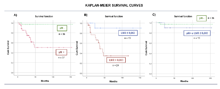 However, when comparing the survival curve of patients without lymph node involvement (pN-) and pN+ patients with LNR≤0.063, no significant difference was observed between the groups, Log Rank test 0.439; p=0.507 (Figure 1-C).