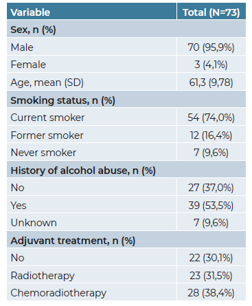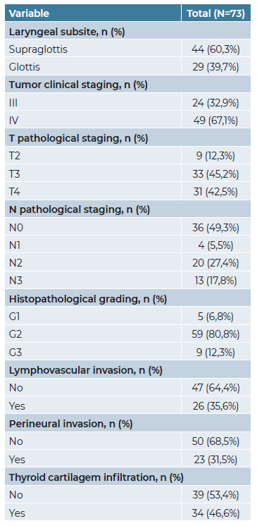 The demographic and clinicopathological characteristics of our cohort are presented in Tables 1 and 2. Regarding tumor location, the majority of patients (60.3%) were diagnosed with supraglottic cancer, whereas 39.7% presented with glottic cancer. Most patients (67.1%) were in stage IV, while 24 patients (32.9%) were in stage III. All patients were submitted to total laryngectomy combined with bilateral neck dissection (level I-V or II-IV). Surgery as a single treatment modality was performed in 22 patients (30.1%), whereas the remaining patients underwent surgery followed by adjuvant radiotherapy (n=23; 31.5%) or chemoradiotherapy (n=28; 38.4%).