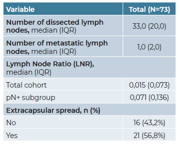 Within the entire cohort, the median LNR was 0.015 (IQR 0.073). Conversely, among patients with metastatic lymph nodes (pN+) - comprising 37 individuals (50.7%) - the median LNR was 0.071 (IQR 0.136). In the subgroup of patients with pN+, the median count of metastatic lymph nodes was 2.0 (IQR 2.0). Furthermore, extracapsular spread (ECS) was observed in 21 patients (56.1%).