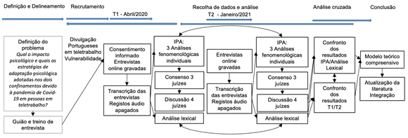 De uma recolha de dados inicial com 20 participantes, apenas 10 profissionais portugueses em situação de teletrabalho se disponibilizaram a realizar as duas entrevistas (80% Mulheres; 20% Homens) com idades compreendidas entre os 22 e os 51 anos (M=33.6, DP=9.66), licenciados, 80% casados/união de facto e 30% com filhos. A fim de responder às questões em estudo, foram realizadas entrevistas semidiretivas online em dois cortes temporais, na 1ª vaga pandémica/confinamento entre Abril/2020 (tempo 1-T1) e na 3ª vaga pandémica/confinamento Janeiro/2021 (Tempo 2-T2) com a inclusão de três questões relativas às duas últimas semanas: 1) Quais os principais impactos da pandemia Covid-19 na sua vida? 2) Que sentimentos experienciou? 3) Que estratégias adota para lidar com a situação? Esta técnica de recolha de dados qualitativos é útil na compreensão de novos fenómenos, permitindo a emergência de conteúdos, experiências subjetivas, valores, crenças, sentimentos e emoções, próximos da realidade (Aarsand & Aarsand, 2018). A participação foi voluntária, mediante consentimento informado, garantindo o anonimato/confidencialidade, e possibilitando a desistência. As entrevistas foram gravadas, transcritas, preparadas num corpus e apagadas após análise, seguindo o Regulamento Geral Proteção de Dados-RGPD.