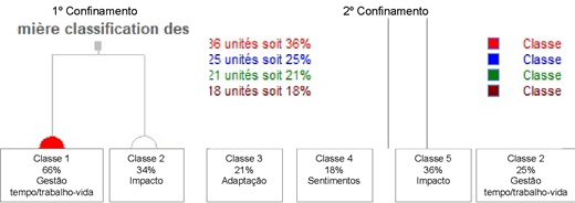 O primeiro isolamento, como era ainda uma situação nova e completamente desconhecida, teve um maior impacto para mim, nessa primeira fase senti alguma ansiedade e muitos receios/medos relativamente ao contágio.” (mulher, 37 anos, s/filhos; X 2 = 19). A classe 2-Gestão tempo/trabalho-vida (25%) compreende o equilíbrio/gestão quotidiana e adoção de novas rotinas: “(...)A pandemia está a ser passada em família realizando teletrabalho e cursos e-learning, com as escolas em funcionamento é mais fácil o teletrabalho, pois uma criança de 6 anos com aulas online não é de fácil gestão.” (mulher, 44 anos, separada, 1/filho; X 2 = 36). A Classe 3-Adaptação (21%) incorpora estratégias de autorregulação/coping: “O isolamento e a-distância) para com as pessoas de quem mais gostamos é realmente complicado e difícil para todos. O facto de continuar a trabalhar a partir de casa, de aproveitar o tempo para treinar em casa, ver series/filmes, cozinhar e organizar coisas que já há muito tempo pretendia fazer, mas adiava, mantém-me com a mente ocupada e tranquila.” (mulher, 37 anos, s/filhos; X 2 = 22). A classe 4-Sentimentos (18%): “não) é um esforço de todos, o que faz com que me sinta um pouco frustrado e desiludido, o meu estado de espírito, normalmente é assim, às vezes sinto me um pouco mais em baixo é verdade porque nós vemos os casos a aumentarem as coisas a descambarem.” (homem, 36 anos, s/filhos; X 2 = 22). A CHA confirma a CHD, nos dois momentos que, junto com a contextualização das UC’s no corpo de texto, atesta os temas emergentes da IPA.
