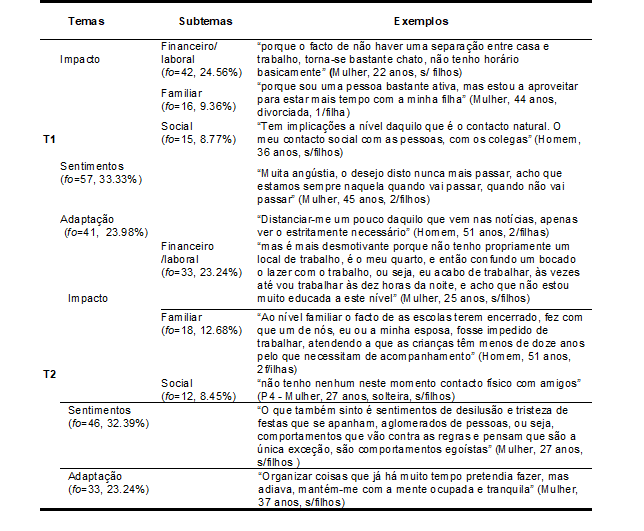 O consenso entre a análise fenomenológica independente resultou nos temas centrais das entrevistas e na emergência de subtemas: 1) Impacto (T1-42.73%/T2-44.37%); 2) Sentimentos (T1-57.31%/T2-55.63%); 3) Adaptação (T1-41%/T2-23.24%). Verificamos que a temática Sentimentos é expressiva em número de ocorrências, seguida do impacto e adaptação, verificando-se uma alteração temporal (tabela 1). Em T1, a qualidade/tempo em família foi valorizada positivamente (30%); salientamos o impacto do confinamento no quotidiano, sobrecarga laboral, gestão de múltiplos papéis e dificuldade no equilíbrio trabalho-família e “em desligar do trabalho”. Socialmente, o impacto apontado foi a falta de liberdade e de contacto físico (80%). Os sentimentos de solidão, medo do contágio e ansiedade associados ao vírus, foram prevalentes, adotando intuitivamente, antes de qualquer campanha informativa, estratégias de autorregulação e coping adaptativas como: atividade física, evitar as notícias; controlar o tempo de ecrã/redes sociais, positividade. Em T2, as dificuldades na gestão quotidiana e equilíbrio trabalho-vida/família mantêm-se (12.68%), acusando desgaste nas condições laborais e sobrecarga de trabalho (23.24%). Ainda que os sentimentos de ansiedade face ao vírus tenham diminuído, aumentam as menções de solidão e isolamento social (32.39%).