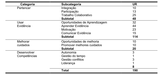 Da análise efetuada ao conteúdo do FG emergiram 190 unidades de registo, organizadas em quatro categorias: Pertencer, Usar evidência, Melhorar Cuidados e Desenvolver competências e respetivas subcategorias (Tabela 1).