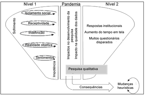 Esse estudo objetivou apresentar uma experiência de pesquisa qualitativa com homens sobre violência doméstica durante a pandemia da COVID-19. Nesse sentido, os participantes foram recrutados por meio da aplicação de um questionário exploratório divulgado em plataformas de mídia social. Esse não era o modelo proposto originalmente pelos pesquisadores, mas sim um modelo alternativo que emergiu apósa eclosão da pandemia da COVID-19. Assim, a experiência dos pesquisadores foi interpretada segundo a técnica expressivo-criativa “redemoinho de ideias” (Ontoria et al., 2014). As transformações metodológicas provocaram sentimentos, impressões e novos significados (os pesquisadores no centro) sobre como conduzir a pesquisa qualitativa diante de uma situação percebida como sem controle (o redemoinho; a pandemia). Nesse sentido, evidenciou-se dois níveis de complexidade. No primeiro nível aparece o impacto da pandemia na vivência prática dos pesquisadores, incluindo os sentimentos envolvidos. No outro nível foram reveladas as respostas institucionais de suporte, o aumento do tempo de trabalho em tela e o aumento do número de pesquisas divulgadas on-line por diferentes grupos de pesquisas, com diferentes interesses e delineamentos. Segundo esse modelo interpretativo, o desenvolvimento da pesquisa qualitativa e os impactos do modelo remoto no desenvolvimento e na qualidade dos dados estão no centro. Essas interpretações estão sintetizadas e representadas na Figura 1.