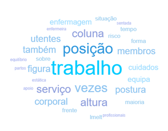 A organização de um turno de trabalho e a tomada de decisão sobre a adoção dos princípios da biomecânica é complexa e pode ser relevada para segundo plano pela existência de vários focos de atenção, com a obrigatoriedade de rapidamente se passar de uma posição estática para uma dinâmica (Baixinho, Presado, Marques, & Cardoso, 2016b). Na análise da nuvem de palavras as que emergem com maior expressividade são trabalho e posição, o que de algum modo relaciona bem as dificuldades associadas ao volume de trabalho, diversidade de atividades e alterações frequentes de posição.