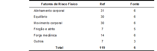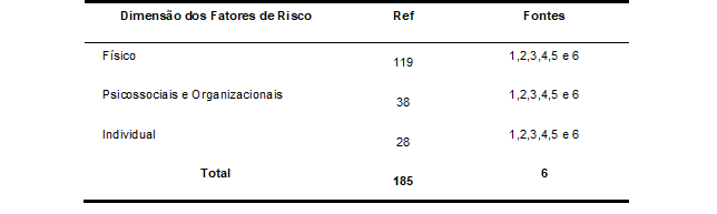 O resultado da codificação dos textos permite-nos verificar que, das 185 unidades de enumeração (referencias) obtidas: 119 correspondem aos fatores de risco físico, 38 aos fatores de risco psicossociais e organizacionais e, 28 aos fatores de risco individual (Tabela 1).