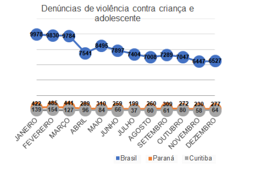No que se refere ao impacto da violência contra crianças brasileiras na pandemia de COVID-19, o Painel de Dados da Ouvidoria Nacional dos Direitos Humanos revelou que, durante o ano de 2020, ocorreram 95.247 denúncias e 368.333 violações contra crianças e adolescentes, sendo o grupo vulnerável com maior número de denúncias relatadas no país. Deste total, o Paraná é responsável por 3.753 denúncias (3,94%) e 14.411 violações (3,91%) e o município de Curitiba, por 1.026 denúncias (2,91%) e 4.088 violações (1,10%). É válido lembrar que uma denúncia pode conter uma ou mais violações de direitos humanos (Ministério da Família, da Mulher e dos Direitos Humanos, 2020).