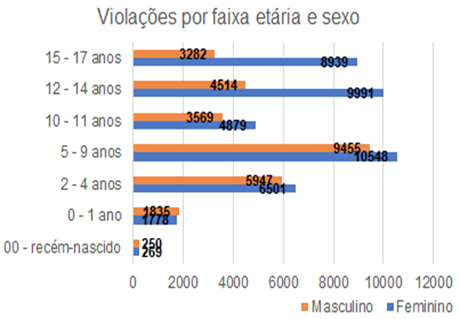 Os dados declarados nas denúncias referentes ao sexo e à idade ajudam na caracterização do perfil das crianças e adolescentes em situação de violência na pandemia de COVID-19. O maior número de vítimas do sexo feminino está associado à desigualdade de gênero, que estabelece relações de poder distintas entre homens e mulheres. Dessa forma, é possível constatar a subalternidade de gênero desde a infância (Fornari, Sakata, Egry, & da Fonseca, 2018). A Figura 3 exibe o quantitativo de vítimas por sexo para recém-nascido, crianças e adolescentes.