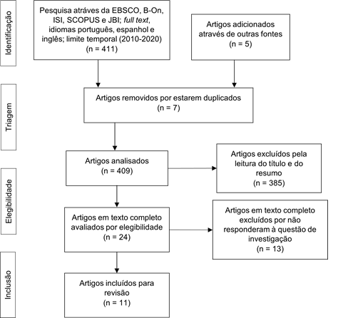 Identificaram-se 416 artigos na pesquisa, com os descritores supracitados. A leitura do título possibilitou a identificação de 7 artigos repetidos. A leitura do resumo permitiu excluir 385 estudos que não respeitavam os critérios de elegibilidade predefinidos. Leram-se na íntegra 24 artigos, foram rejeitados 13 artigos por não responderem à questão de investigação. Os 11 artigos finais contemplam a amostra bibliográfica final (Figura 1).