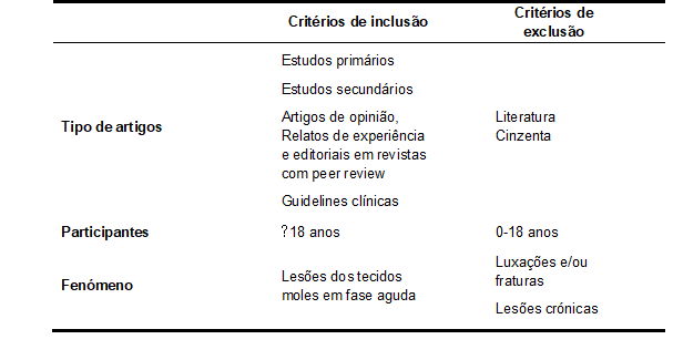 A presente Revisão Integrativa da Literatura (RIL) foi orientada pela seguinte questão de investigação: “Quais as intervenções preconizadas nos protocolos para a gestão de lesões dos tecidos moles em fase aguda, na população adulta e idosa?” elaborada utilizando a mnemónica PICo (população, fenómeno de interesse e contexto) (Souza, Silva, & Carvalho, 2010; Sousa, Marques-Vieira, Severino, & Antunes, 2017).