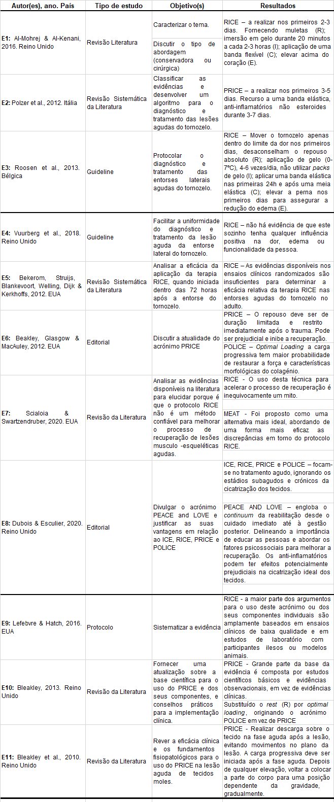 Os acrónimos que foram realçados nos estudos elegíveis para esta RIL são: RICE (Al- Mohrej & Al-Kenani, 2016; Roosen et al., 2013; Vuurberg et al., 2018; Bekerom et al., 2012; Scialoia & Swartzendruber, 2020; Lefebvre & Hatch, 2016); PRICE (Polzer et al., 2012; Beakley, Glasgow & MacAuley, 2012; Bleakley, 2013); POLICE (Beakley, Glasgow & MacAuley, 2012; Bleakley, 2013); MEAT (Scialoia & Swartzendruber, 2020) e PEACE and LOVE (Dubois & Esculier, 2020).