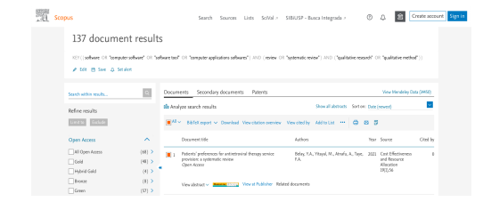 Os critérios de elegibilidade precisam ser explicitados na RL para determinar quais estudos são relevantes para a seleção e composição da amostra revisada. Esses critérios também são fundamentais para quando a revisão é realizada em equipa porque serão um mecanismo de facilitação da comunicação. Diante disso, definir os critérios de inclusão e exclusão delimita a área de interesse para o objetivo da revisão. Ao excluir, por exemplo, os estudos apresentados em conferências científicas de forma resumida não quer dizer que estes não são importantes para conhecer o estado da arte, mas que para esta revisão mostram-se limitados devido à apresentação sintetizada do método de pesquisa. Relembra-se que este exemplo é simplesmente didático, não se pretende esgotar todas as perspetivas de análise sobre o fenômeno da RL. Numa RL as fontes de informações podem ser diversas tais como artigos, livros, enciclopédias, resumos de conferências, dissertações e teses, bem como outras consideradas relevantes para cada estudo. Para efeitos deste capítulo, a seleção das fontes de informação recai sobre as bases de dados referenciais. Destaca-se que a seleção de quais bases de dados serão consultadas depende do âmbito e dos objetivos da revisão. Como as diversas bases de dados referenciais têm características distintas e abarcam diferentes tipos de publicações, há que ter algum conhecimento sobre essas características (Pinho & Diogo, 2018). A busca nas bases de dados é realizada por meio de descritores (termos e palavras-chave) associados aos operadores booleanos AND, OR ou NOT. A associação entre os descritores e os operadores booleanos constitui a estratégia de busca. Além disso, a equipa de pesquisa pode aplicar filtros relativos aos metadados, ao limite temporal, à área de conhecimento, ao país e ao tipo de documento. A estratégia de busca deve detalhar as fontes de informação e o modo como serão pesquisadas. Indicar o âmbito, ou seja, se pretende recolher informação exaustiva em várias bases de dados e diferentes línguas, ou se é uma procura mais focada, restrita a algumas revistas científicas e uma língua, são caminhos da estratégia a definir, explicar, justificar e respeitar. Nenhuma base de dados permite uma recolha exaustiva, é necessário ter a noção de que as publicações recolhidas não contemplam toda a publicação definida pela questão de revisão. Por exemplo, comparando a Web of Science e a Scopus, verifica-se que a Scopus tem um âmbito mais alargado, onde as Ciências Sociais estão amplamente representadas. A Scopus tem um caráter multidisciplinar e maior cobertura global, o que são argumentos para a presente escolha para efetuar a recolha de informação usada para elaborar este capítulo (Figura 1). O tema é a RL, especificamente no âmbito das ferramentas digitais usadas para apoiar a análise qualitativa da informação recolhida. Deste modo, foi desenvolvida a seguinte estratégia de busca: (“software” OR "computer software" OR "software tool" OR "computer applications softwares") AND (“review” OR "systematic review") AND ("qualitative research" OR "qualitative method"). Neste caso, também foi aplicado o filtro das palavras-chave, ou seja, a base de dados realizou a busca das publicações que haviam citado todos ou parte desses termos como descritores nos metadados. Ao final da busca obteve-se 137 referências.