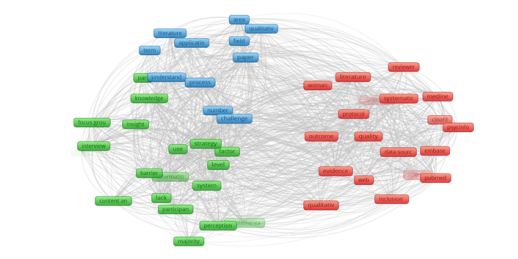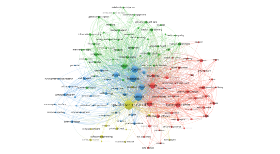 A rede de co-ocorrência das palavras-chave indica 4 clusters. É possível identificar as palavras-chave que constituem cada cluster, o que pode indiciar diversas abordagens do tema. A exploração desta ferramenta depende da competência no seu uso e do conhecimento sobre a temática. O relatório da RL aparece no final, mas este é construído desde o início da revisão. A metodologia deve estar o mais explícita possível. Os resultados devem abarcar a apresentação da análise descritiva e as sínteses feitas. Estas sínteses devem contribuir para dar a resposta à questão de revisão. As sínteses num nível mais básico podem juntar informação de diversas publicações para cada código, apresentando alguns excertos de publicações, ou apresentando tabelas resultantes de questionamento aos dados após codificados. O nível seguinte é o da interpretação desses resultados. A integração deste tratamento de dados e informação irá depender do conhecimento prévio, da leitura e tratamento da bibliografia selecionada e do alinhamento com a questão de revisão. O modo de apresentação deste relatório depende da audiência a atingir. Se pretender contribuir para o desenvolvimento teórico de um determinado tópico a opção pode ser a publicação de um artigo ou capítulo, mas se o objetivo é o de fornecer informação para a melhoria de funcionalidades, de um determinado software de apoio à RL, o produto final pode ser um relatório onde as funcionalidades tenham uma preponderância e o tratamento dos dados pode ser aprofundado nessa área através de uma análise complementar de questionário a utilizadores de software. As limitações, da revisão realizada, devem ser identificadas e indicadas. Estas limitações devem ser vistas sobre em que medida a revisão atinge os objetivos previamente identificados, bem como a resposta à questão de revisão.