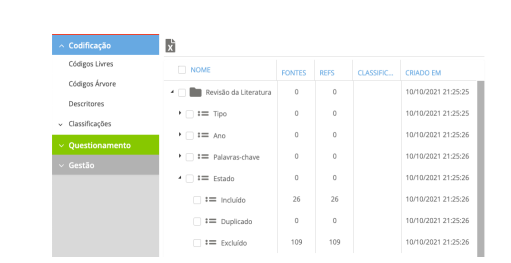 Na Figura 2 é possível observar que as 137 referências exportadas da Scopus foram inseridas no webQDA por meio do sistema de Fontes. Automaticamente, o software faz a codificação do tipo de publicação, do ano, dos autores, das palavras-chave e do estado (incluído, excluído e duplicado). Mediante a inserção dos metadados no webQDA, por meio do sistema de Fontes > anotações > notas > fonte > carregar metadados, é criada uma pasta chamada "Revisão da Literatura". Nesta pasta, todas as referências apresentam o estado "incluído", com exceção das referências repetidas que migram automaticamente para o estado "duplicado". No caso em tela, não foram identificados artigos duplicados ma vez que foi consultada somente uma base de dados. A primeira etapa de seleção das referências bibliográficas ocorreu mediante a leitura do título e do resumo, seguida pela aplicação dos critérios de inclusão e de exclusão previstos no protocolo de revisão (Figura 3). As referências que não correspondiam aos critérios de inclusão tinham o seu estado alterado para "excluído".