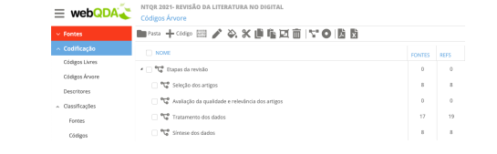 Dos 20 artigos selecionados, 11 foram publicados no ano de 2021, seguido pelo ano de 2020 (03 artigos), 2017 (03 artigos), 2019 (02 artigo) e 2018 (01 artigos). Estes dados revelam um crescente aumento no número de publicações sobre o tema nos últimos anos. No que se refere ao tipo de revisão, destacou-se a revisão sistemática com 15 publicações e a revisão integrativa com 02 publicações. Sobre as ferramentas digitais mais utilizadas, evidenciou-se o NVivo (12 publicações) e o Covidence (05 publicações). Também foram citadas como ferramentas RevMan, Rayyan QCRI, ATLAS.ti, Refworks, EPPI-Reviewer e Quirkos. Todos os estudos selecionados estavam vinculados à área da Saúde. A partir da questão de revisão, as autoras exploraram sobre o uso das ferramentas digitais em quatro etapas principais da revisão: a) seleção dos artigos; b) avaliação da qualidade e relevância; c) tratamento dos dados; d) síntese dos dados. Para tanto, foi utilizada a funcionalidade dos Códigos Árvore do sistema de Codificação (Figura 6).