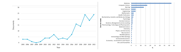 De modo a obter uma visão geral das publicações pode-se fazer uma análise exploratória das referências recolhidas através de uma análise bibliométrica. Apesar de ter sido recolhida uma pequena quantidade de referências, para efeitos didáticos serão usados os mesmos metadados do exemplo anterior, para fazer a análise bibliométrica. A análise bibliométrica pode ser desenvolvida através de diversas técnicas, de modo a fornecer informação sobre a evolução das publicações ao longo de um determinado período de tempo, quais os autores dessas publicações, as instituições e os países (Moresi & Pinho, 2021) . Assim pode-se iniciar com a seguinte questão: Como é a distribuição das publicações ao longo do período de recolha? A Figura 9 mostra que entre 2005 e 2016 recolheram-se menos de 10 publicações em cada ano deste período. A partir dessa data dá-se um incremento de publicações. Quais as áreas onde se situam os documentos recolhidos? Como é mostrado na Figura 9, a maioria dos documentos recolhidos situam-se na área da Medicina.