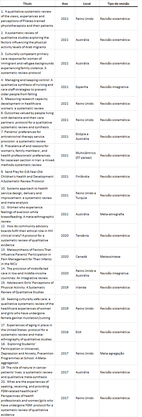 - Foram excluídos estudos que tratavam do tema por meio de abordagem metodológica ou reflexiva, e estudos apresentados em conferências científicas de forma resumida.