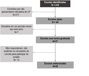 Considerando a especificidade do objeto em estudo, a percepção de docentes sobre o ensino aprendizagem de CP, foi utilizada abordagem qualitativa, uma vez que é a que mais se adequa a responder questionamentos de natureza compreensiva (Correia et al, 2018). Aqui o conceito de percepção é compreendido como o efeito de apreender, perceber, apresentar e conhecer as significações que cada um carrega. Nesse sentido entendemos que o homem age a partir de suas representações, constituídas a partir de suas interpretações sobre o processo ensino-aprendizagem em CP, uma vez que esse está relacionado a proximidade da morte e do morrer, influenciando as atitudes perante essa etapa da vida. (Bifulco, 2009)(Geertz, 2017). Esse estudo baseia-se em recorte de pesquisa maior sobre o ensino de CP no Brasil em que foram mapeadas todas as Instituições de Ensino Superior (IES) de Medicina do Brasil e seus currículos para identificação daquelas que incluem esse ensino e a análise de como está sendo desenvolvido segundo a percepção de coordenadores, docentes e alunos. A técnica escolhida para a produção de dados foi a entrevista semiestruturada com os coordenadores dos cursos de Medicina e docentes das disciplinas em CP das escolas que a dispunham em sua grade curricular. Das 315 escolas médicas (EM) existentes até o final de dezembro de 2018, segundo o sistema e-MEC de Instituições de Ensino Superior (IES) e Cursos Cadastrados, apenas 44 dispunham de disciplina de CP em suas matrizes curriculares (Castro et al, 2021) (Sistema e-MEC, 2017). Dessas 44 escolas, em sete a disciplina era ministrada há menos de 6 anos, ou seja, não havia ainda nenhuma turma de médicos formada. Foi feito contato com as 37 escolas restantes e o convite aos seus coordenadores de curso e docentes em CP para participar do estudo. Somente 25 responderam e/ou aceitaram participar conforme ilustra a Figura 1.