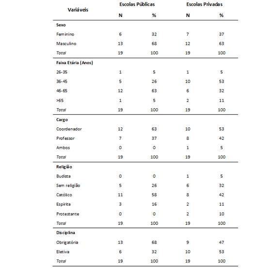 As informações sociodemográficas dos entrevistados estão apresentadas na Tabela 1. As entrevistas foram realizadas com docentes de escolas públicas e privadas em igual proporção. A maioria dos entrevistados foi de coordenadores de curso (23=60,5%), sendo que um deles também era professor da disciplina de CP. Houve predominância de docentes do sexo masculino (25=66%) e de profissionais acima de 35 anos, com mais de 10 anos de experiência. Quanto à religião, 71% relataram ser praticante, sendo a maioria católicos (70,3% dos religiosos). A disciplina era obrigatória em 59% das escolas.